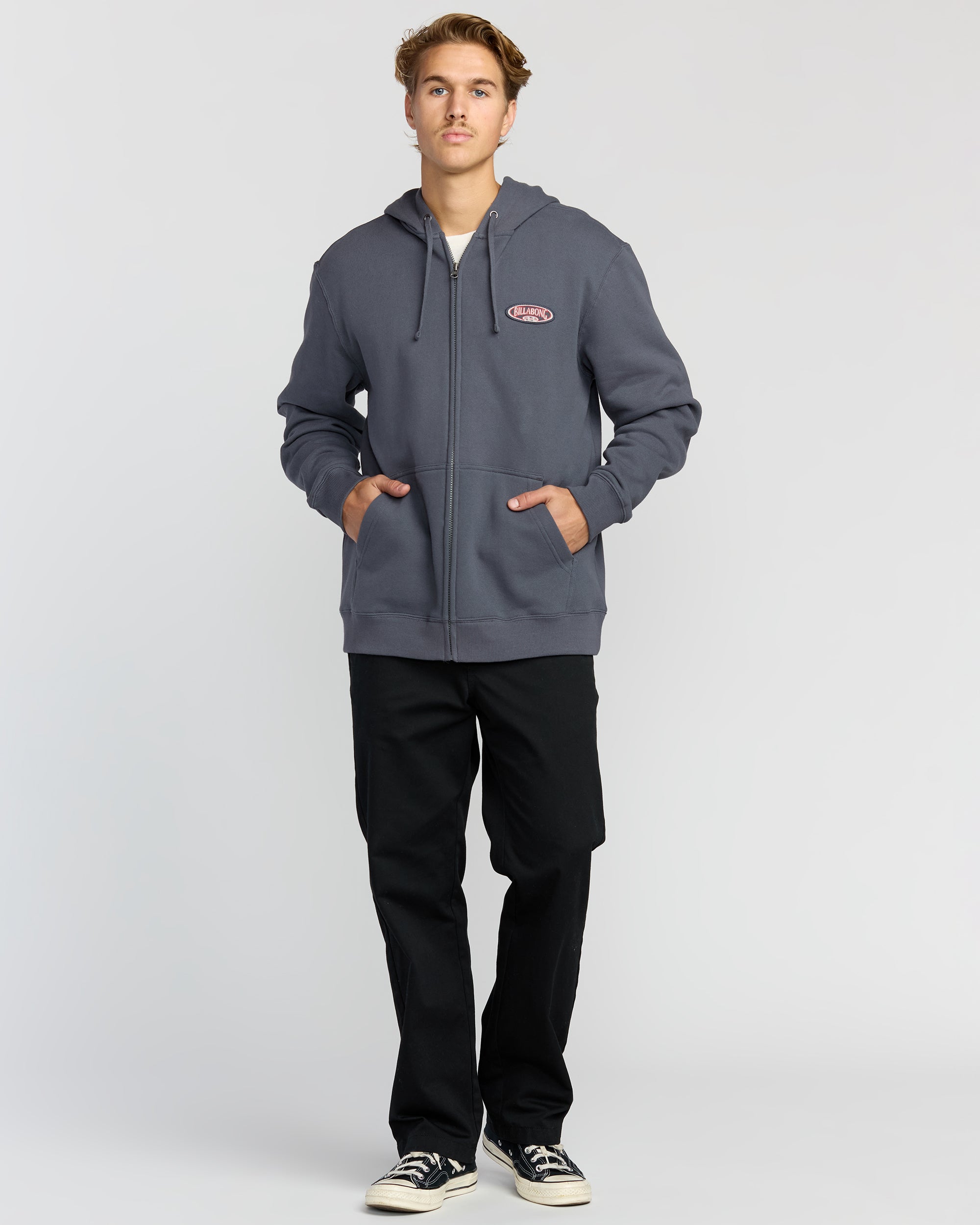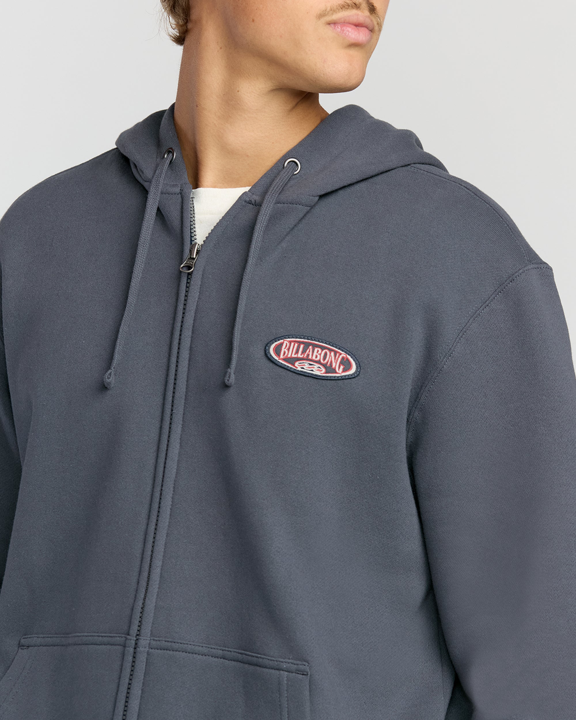 Our cotton-rich zip sweatshirt brings back the classic oversized fit you love, with wider shoulders and longer sleeves. The front pouch pocket keeps essentials close, while the chest patch adds subtle style. Featured here in the Blue colorway.