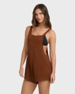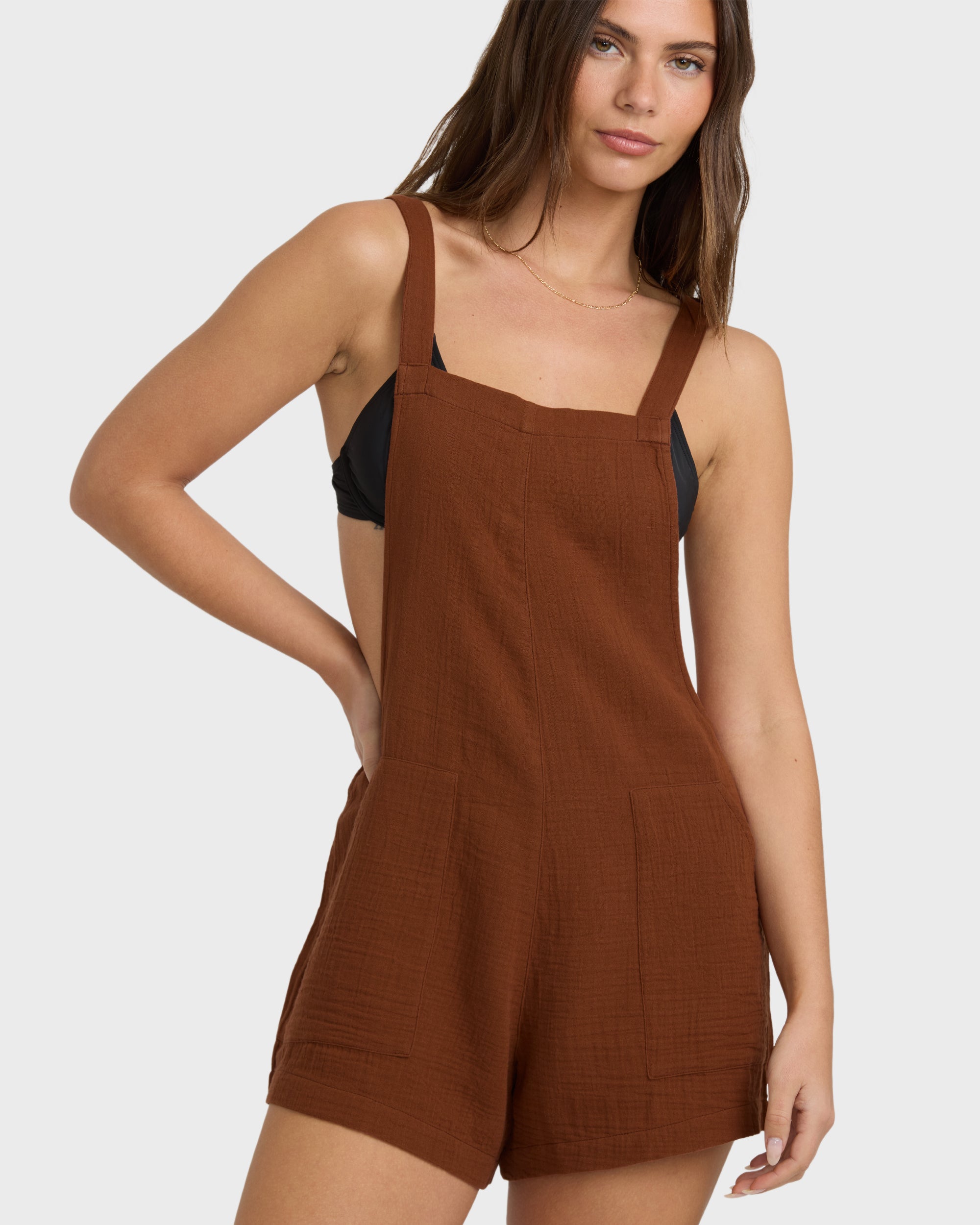 Bring some romance to your warm-weather look with the Beach Crush Romper from Billabong’s Essentials Collection. Made from comfy cotton double gauze fabric for a soft and lightweight feel, it combines a square neckline, adjustable shoulder straps, multiple pockets, and metal plate branding at the back waist. Featured here in the Cowhide colorway.