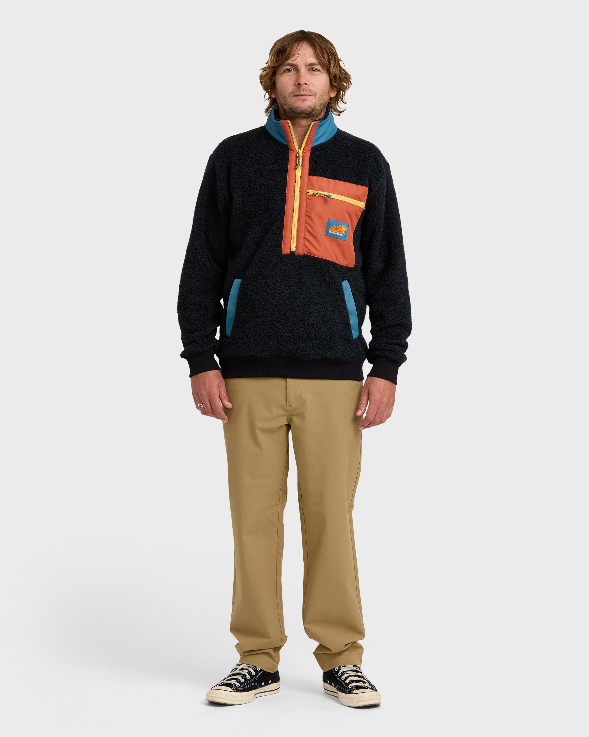 Our throwback fleece sweatshirt brings classic style with modern comfort. Slightly oversized for that vintage vibe, with contrast ripstop panels, hand pockets and a zippered chest pocket for essentials. Featured here in the Black colorway.