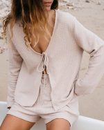 Our Maya Long Sleeve Top brings casual vibes with its relaxed fit and textured cotton-blend fabric. The v-neckline features a stylish tie detail and hook and eye closure for adjustable coverage, while the metal plate adds a subtle finishing touch. Perfect for everyday wear with jeans or layered under your favorite jacket.
