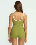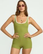 Our sun-soaked women’s one piece surf suit blends retro style with a scooped low back for chic mobility. Partially recycled nylon material and contrast piping make this shorty women’s one piece the perfect choice for paddling out.