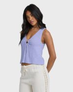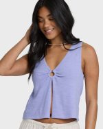 Our Veda Knit Tank brings effortless style with its cotton-rich fabric and distinctive V neckline featuring an O-ring detail. The fly away hemline creates a relaxed, flattering fit, while the metal plate adds just the right touch of sophistication. Perfect for pairing with your favorite shorts or jeans.